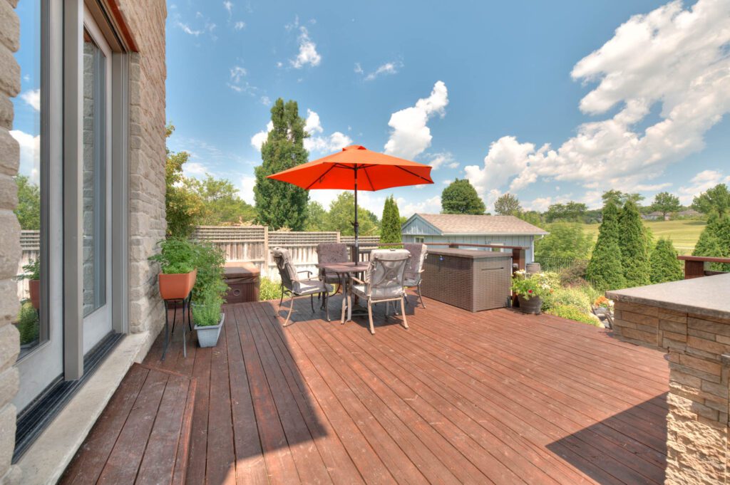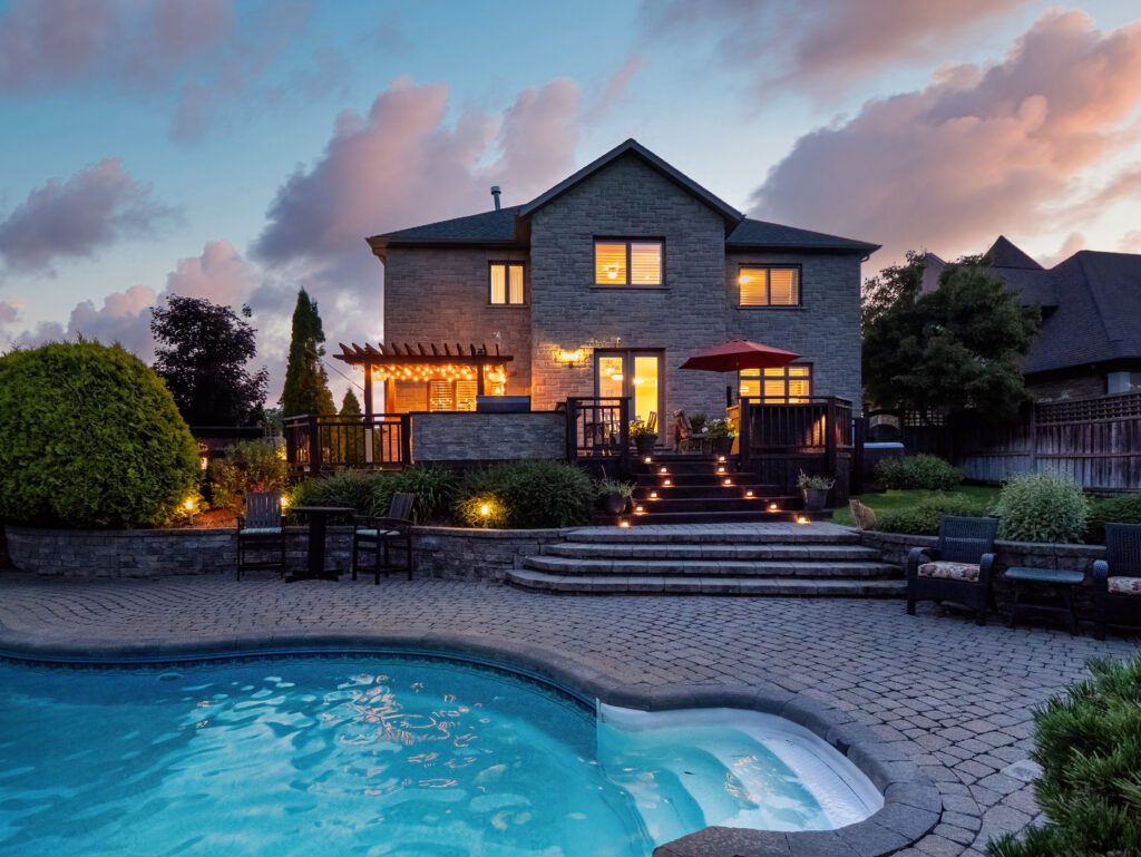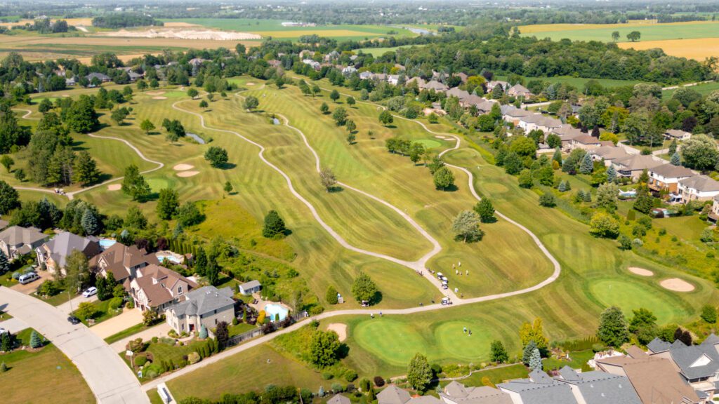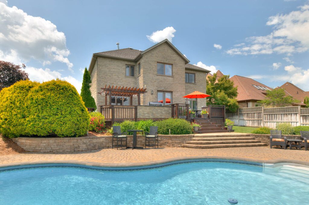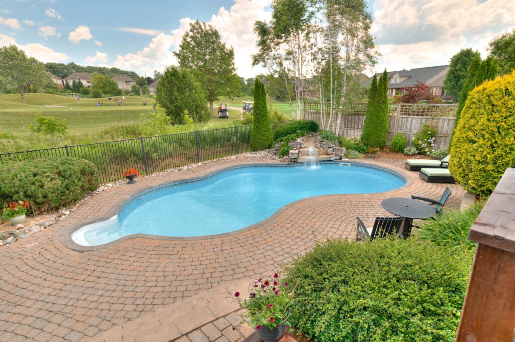 Backing onto Conestogo Golf Course with stunning views of lush greens and manicured fairways, this elegant custom home offers the perfect blend of luxury, comfort, and location. Enjoy the charm of small-town living just steps from the Grand River and nearby trails, while only a 10-minute drive to Waterloo, St. Jacobs, and Elmira. A welcoming vestibule opens to a grand curved staircase and center hall layout. Natural light fills the home, showcasing crown moulding, California shutters, and rich maple hardwood. The living room, currently a music room, provides flexibility, while the formal dining room features pot lights, elegant trim, and direct access to the high-end maple kitchen. Designed for function and style, the kitchen boasts granite counters, a custom hood, built-in appliances, wall-to-wall pantry storage, and an 8-ft island with breakfast bar. The dinette opens to a deck overlooking the golf course and your private backyard retreat. The family room features a tray ceiling, built-ins, and gas fireplace. A 2-pc bath and mudroom are located off the garage entry. Upstairs offers four bedrooms, a home office with custom built-ins, upper laundry with cabinetry, and a 4-pc bath. The primary suite features double-door entry, custom walk-in closet, double-sided gas fireplace shared with the 5-pc ensuite which has granite counters, a jetted tub, and body-jet shower. The finished basement includes a rec/media room, gym, 4-pc bath, and a newly constructed Wine Bar…a destination in itself. With cedar plank ceilings and a warm, inviting aroma that awakens the senses, this space feels like a getaway. Pull up a stool at the bar, complete with built-in wine and beverage fridges, or cozy up by the fireplace with a blanket to enjoy a movie or the big game. The fully fenced backyard boasts an in-ground pool with waterfall, two-tier deck with outdoor kitchen, bar, pergola, hot tub, and gas firepit. Stamped concrete and lush gardens complete the curb appeal.