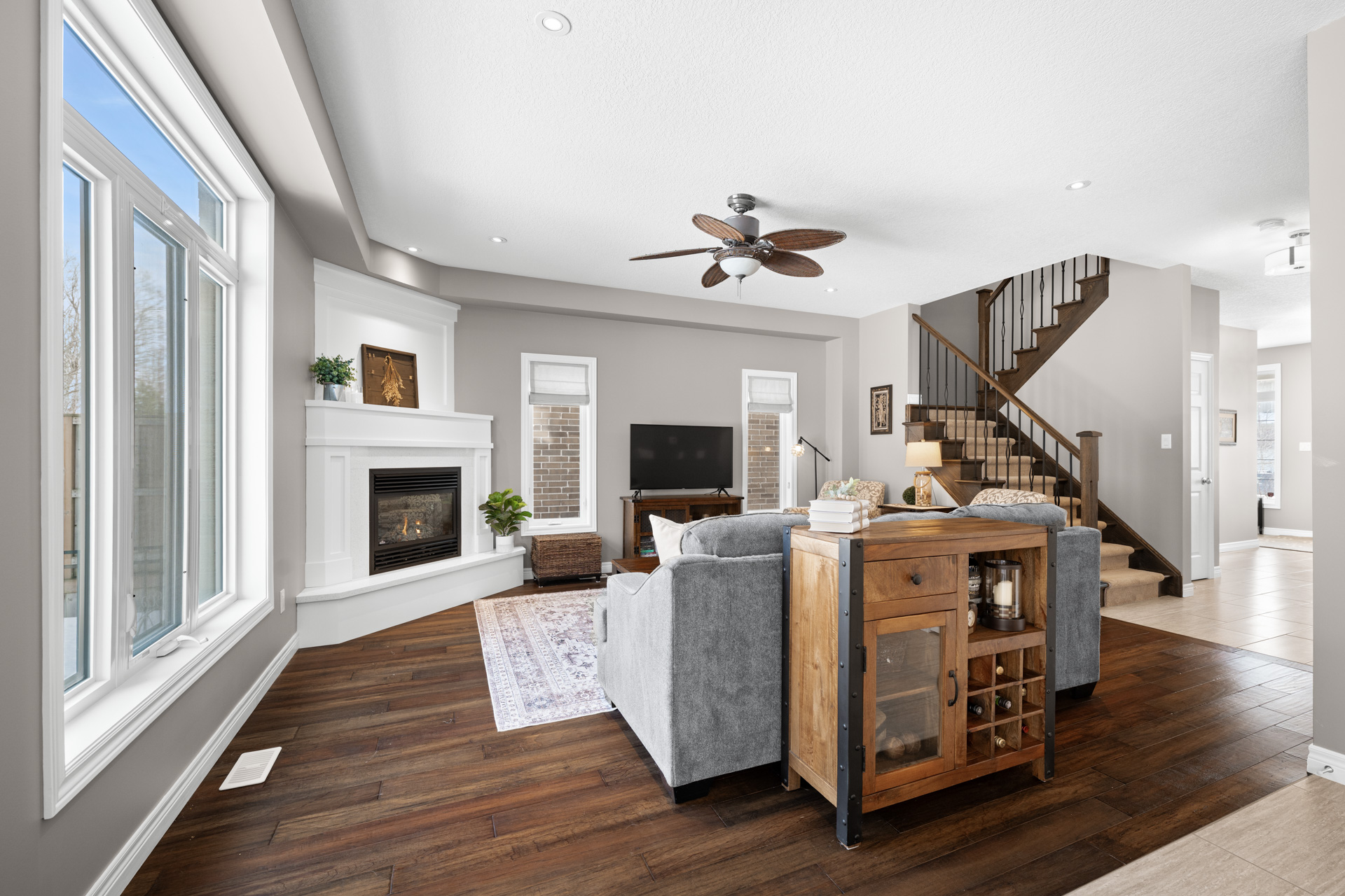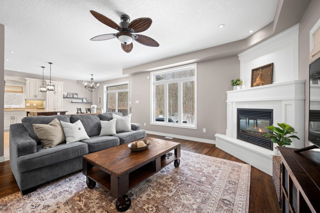 From the moment you step into the spacious foyer, you will appreciate the thoughtful design, generous proportions, and upgraded finishes throughout. The main floor features 9 foot ceilings and upgraded 24 x 12 tile flooring, creating a bright and open feel. The living room is warm and inviting with rich hardwood floors, a stunning quartz wrapped fireplace with an extra deep hearth designed for additional seating, and large windows overlooking the peaceful natural setting.