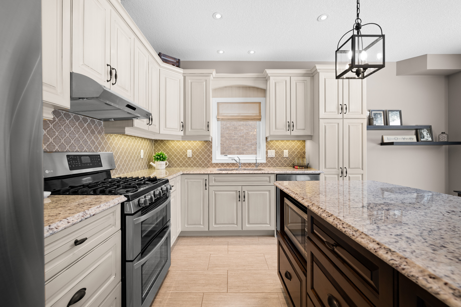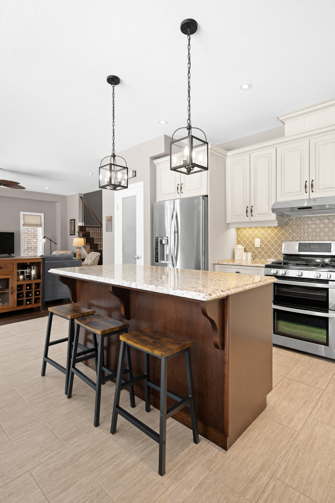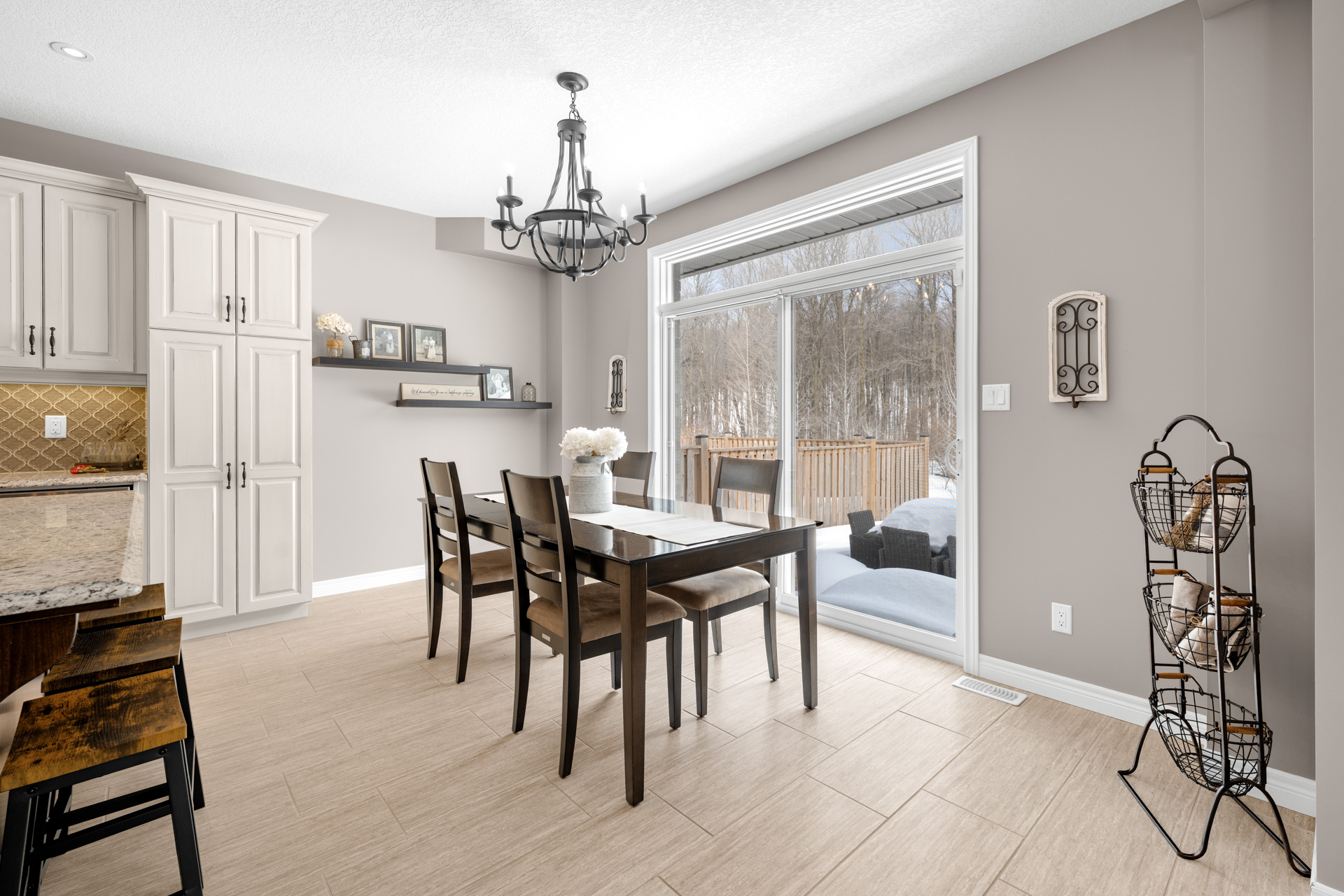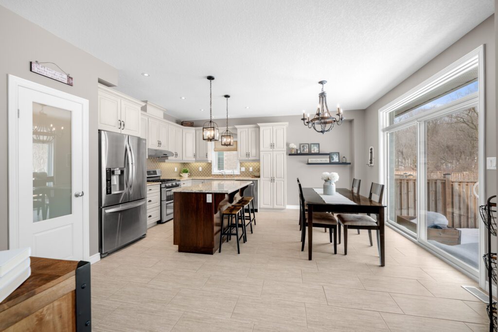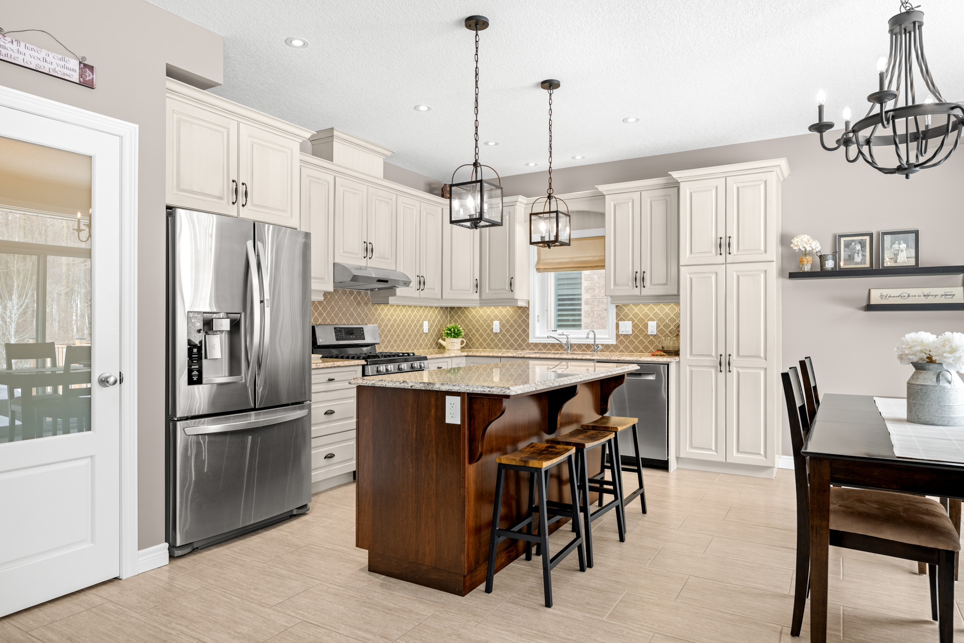 The kitchen is a true showpiece with full height cabinetry, granite countertops, a striking tile backsplash, under cabinet lighting, stainless steel appliances including a gas range, and a large island with seating. The custom walk in pantry offers exceptional storage with built in shelving, making it ideal for organizing dry goods, small appliances, and bulk shopping. An 8 foot sliding glass door leads to the backyard and stamped concrete patio, perfectly positioned to enjoy the treed views and direct access to nearby trails. The dining area flows seamlessly from the kitchen, making it ideal for everyday living and hosting family gatherings.